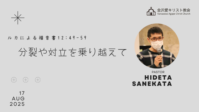 牧師ブログ 「分裂や対立を乗り越えて」 2025年8月17日 kanazawa-agapechurch https://kanazawa-agapechurch.com/wp-content/uploads/2018/12/text.png 金沢愛キリスト教会 分裂や対立をもたらすために これはイエスが語っている言葉だが、かなり衝撃的な内容が含まれていました。 イエスがは「地上に火を投ずる」「分裂をもたらす」「対立してわかれる」と …