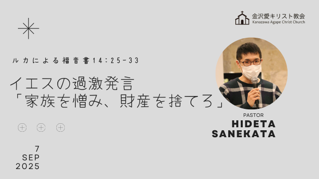 牧師ブログ 「イエスの過激発言『家族を憎み、財産を捨てろ』」 2025年9月8日 kanazawa-agapechurch https://kanazawa-agapechurch.com/wp-content/uploads/2018/12/text.png 金沢愛キリスト教会 イエスにかけられた期待 イエスがご自分についてくる群衆に対して、次のように語りました。 26節「もし、だれかがわたしのもとに …